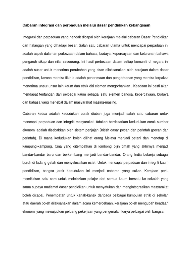 Cabaran Dasar Pendidikan Negara Dalam Intergrasi Perpaduan Pdf